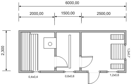 Лофт-11 — каркасная баня 6х2,3 с площадью 14 м². Парная, душевая и комната отдыха. Ключевой акцент проекта: автономный душ.